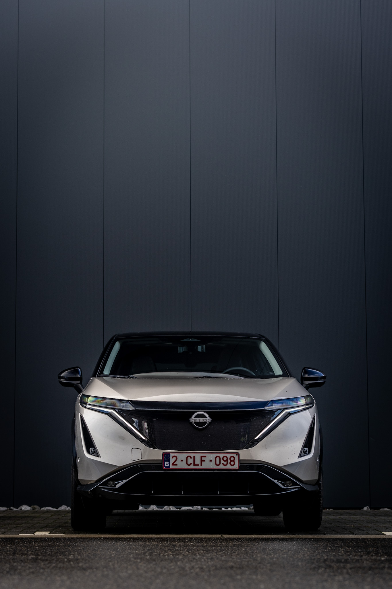Als we de buitenkant van de ARIYA bekijken zien we een elegante zelfs stijlvolle wagen. Door een zwart dak te gebruiken op de wagen en de afhellende daklijn toont het als een compacte SUV, maar vergis je niet. Deze ARIYA is 4,6m lang bijna even groot als de Skoda Enyaq op een paar millimeter na. Wat zeker in het oog springt aan deze wagen is vooraan de grote zwarte plaat met Kumiko-patroon met daarin verwerkt de opvallende LED-dagrijlichten en smalle LED-koplampen. Achteraan de wagen is er het achterlicht dat mooi doorloopt op het kofferdeksel en waar de letters Nissan in verwerkt zijn.